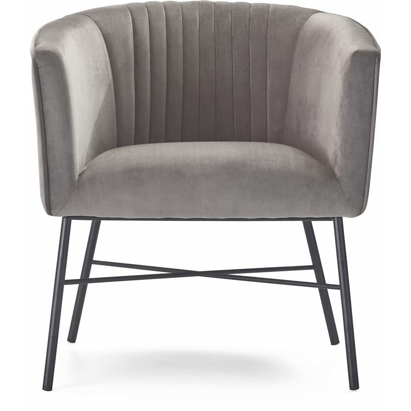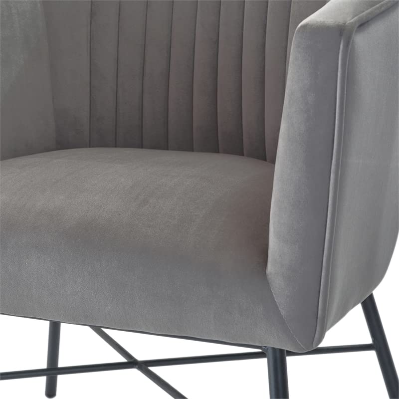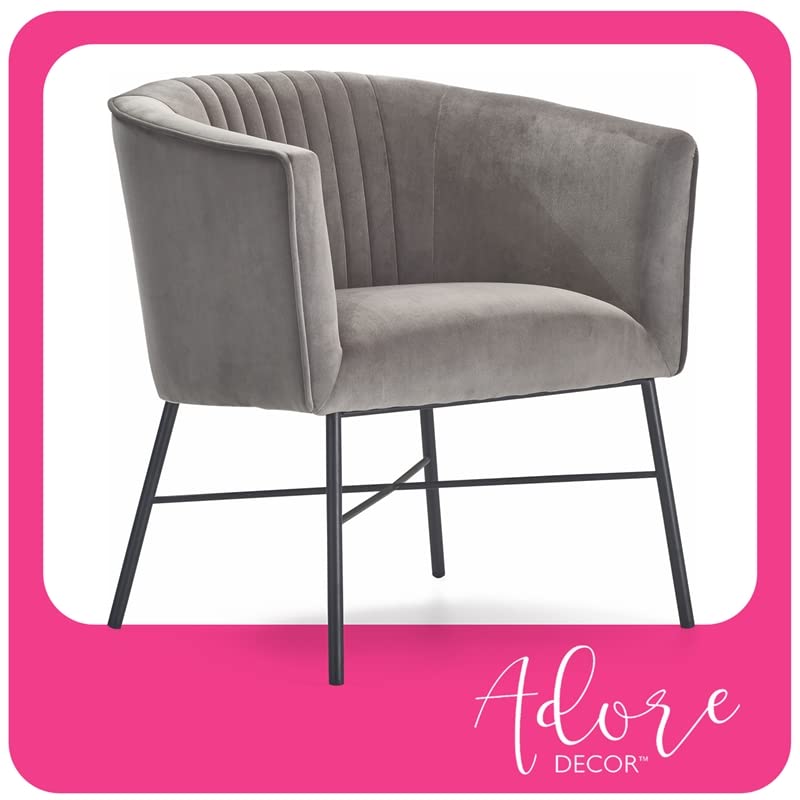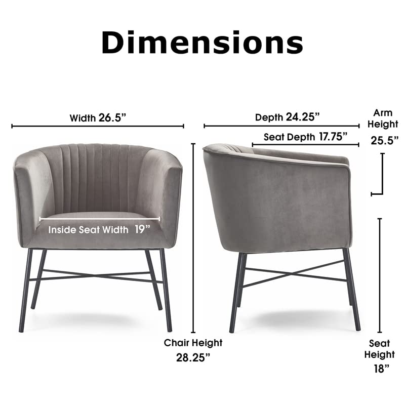 Details: Provide extra seating for guests while elevating the decor of your living room with this chic, modern accent chair. The curved back and sweeping flared arms are cushioned to create an inviting profile. Featuring a sleek channel tufted Back that offers additional comfort and support. Stunning yet simple, Its slim black metal legs are a contemporary balance to the plush velvet fabric upholstery. This charming Mid century armchair will add the perfect touch of glam to your living room, bedroom, or office.