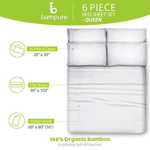 BAMPURE 100% Organic Certified Bamboo Sheets Queen - 6 Piece Set - Superior Soft & Cooling Sheets - Up to 16’’ Deep Pocket - Luxury Series 1 Flat Sheet, 1 Fitted Sheet, 4 Pillowcases (Queen White)