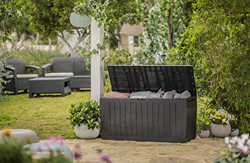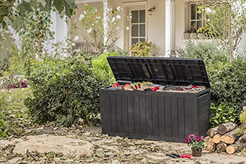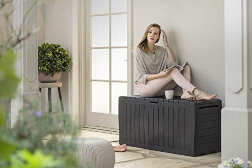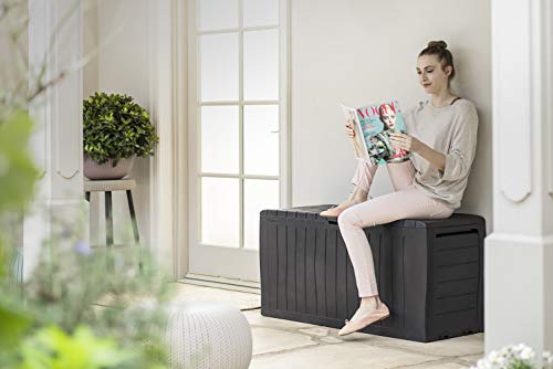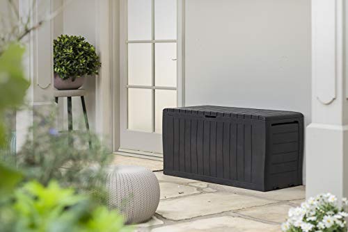 Details: From flower planters to deck cushions, the Marvel storage box holds it all. Store your patio furniture pillows, garden tools, pool toys and deck supplies neatly within the large 71-gallon capacity space. You can also place it indoors at the foot of the bed or in a child's room to hold extra bedding, toys and seasonal clothing. Because of its durable construction, this storage box never buckles or expands no matter how much you store. This plastic storage box has built-in handles and rollers for easy mobility, and it only takes about five minutes to assemble with no tools required. Other benefits of the Keter Plastic box include: Dimensions: 45. 9 in. W x 15. 6 in. D x 22. 4 in. H Large storage capacity can hold up to 71 Gallons Durable polypropylene construction UV-resistant so it will not fade in the sun Never rusts, dents, or peels Complete with built-in handles so it is easy to move Keeps items dry and well ventilated Appealing decorative paneled design Ideal for both interior and exterior use.