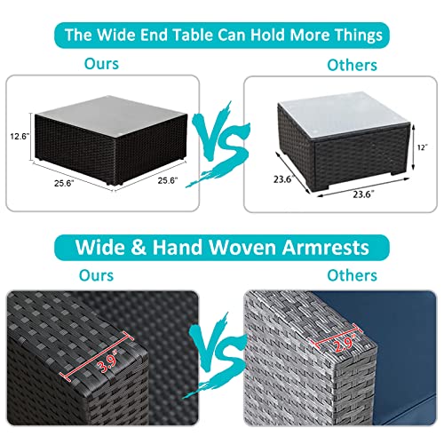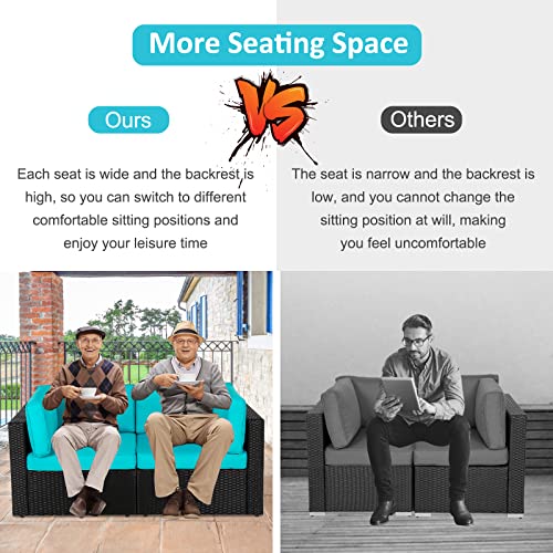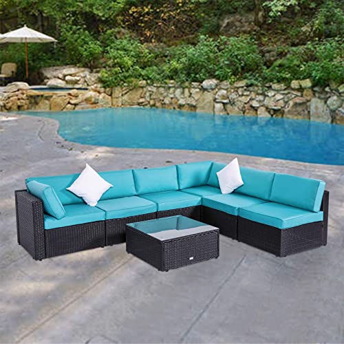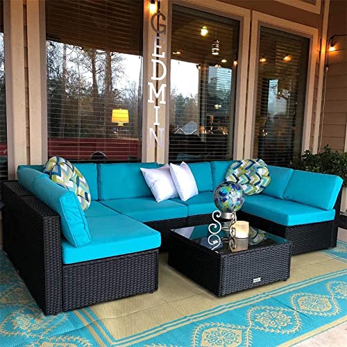 Details: Peach Tree 7 pieces Sofa Set gives you more chances to enjoy leisure time with friends and family. The modern design fits perfectly with any outdoor or indoor decor. In addition, each piece of furniture is independent, so it can be rearranged based on your preference and geography. Composed of lightweight rattan wicker and a sturdy Our covers can be washed and removed. If water is accidentally spilled on the cover, just wipe it gently. It can withstand moderate changeable weather. However, extra protection may be needed for some extreme weather conditions. Best of all, this sofa set includes a tea table and two pillows to increase convenience and comfort. If you want to relax all day in comfort with our 7 pieces sofa set on a cool sunny day or night, please check out Peach Tree Sofa set! Matching Loveseats: B07CQHWW89 Matching chaise Lounge Chair: B076Y1RC7H Matching waterproof cover: B07MF25GJL Matching lounge chair: B07GQLZ7VH Specification: Rattan Color: Black Cushion Color: Turquoise Pillow: White Cushion fabric: 250G polyester fabric and sponge padded Corner Sofa Size (overall): 29.5" L×29.5" W×24.8" H Single Sofa Size (overall): 25.6" L×29.5" W×24.8" H The dimension of side table: 25.6" L×25.6" W×12.6" H Seat cushion: 25.6" L×25.6" W×3.9"H Lumbar pad: 25.6" L×13.4" W×5.5" H Small lumbar pad: 21.7" L×13.4" W×5.5" H Pillow: 15.8" L×15.8" W The thickness of glass top: 0.2 inch Steel Frame Material: Iron. Rattan: PE Set includes: 2×corner sofa 4×single sofa 1×side tea table with glass top 6×seat cushions 6×seat lumbar pad 2×small seat lumbar pad 2×white pillow